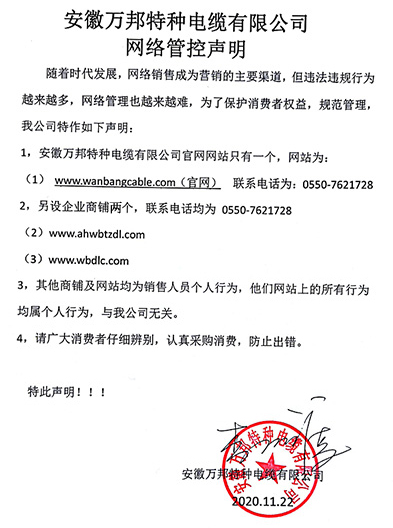 鄭重聲明:安徽萬邦特種電纜有限公司官方網站為:www_wanbangcable_com.huaying-cn.com,除此之外無任何子網站或合作網站,其余均為假冒偽劣。電話:0550-7621728 13485756353 地 址:安徽省天長市滁州高新技術產業開發區經四路29號